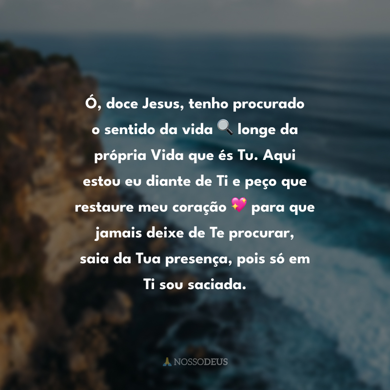 Ó, doce Jesus, tenho procurado o sentido da vida 🔍 longe da própria Vida que és Tu. Aqui estou eu diante de Ti e peço que restaure meu coração 💖 para que jamais deixe de Te procurar, saia da Tua presença, pois só em Ti sou saciada.