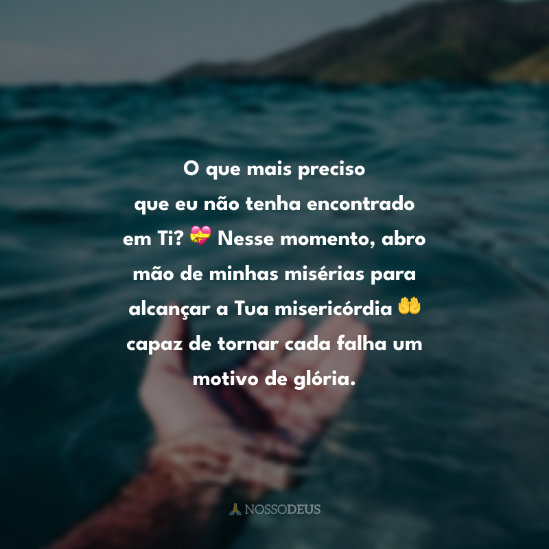 O que mais preciso que eu não tenha encontrado em Ti? 💝 Nesse momento, abro mão de minhas misérias para alcançar a Tua misericórdia 🤲capaz de tornar cada falha um motivo de glória. Eu Te agradeço pela cruz redentora, ✝ pois é nela que diariamente experimento a salvação. Teu jugo é leve; Teu amor, suave e tudo o que é preciso para tornar a recomeçar.