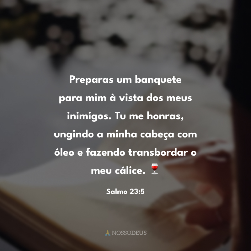 Preparas um banquete para mim à vista dos meus inimigos. Tu me honras, ungindo a minha cabeça com óleo e fazendo transbordar o meu cálice. 🍷