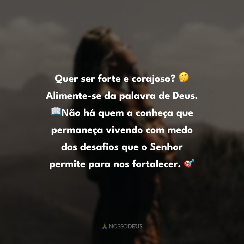 Quer ser forte e corajoso?🤔 Alimente-se da palavra de Deus. 📖Não há quem a conheça que permaneça vivendo com medo dos desafios que o Senhor permite para nos fortalecer. 🎯