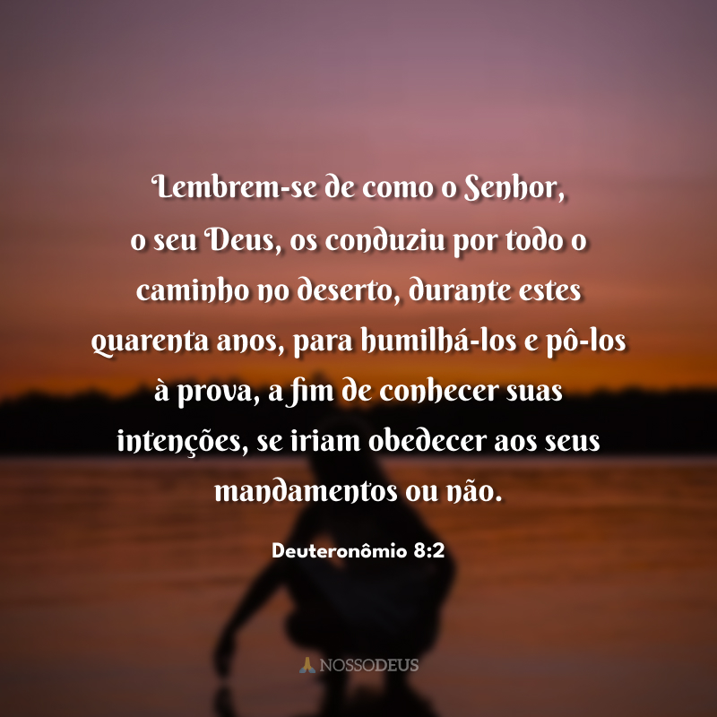 Lembrem-se de como o Senhor, o seu Deus, os conduziu por todo o caminho no deserto, durante estes quarenta anos, para humilhá-los e pô-los à prova, a fim de conhecer suas intenções, se iriam obedecer aos seus mandamentos ou não.
