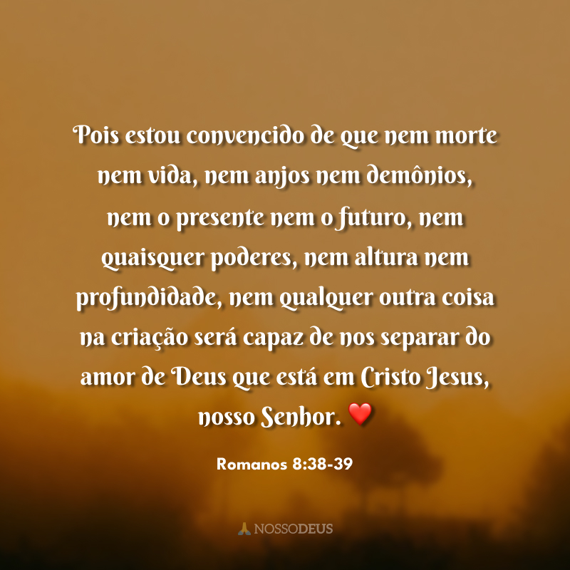 Pois estou convencido de que nem morte nem vida, nem anjos nem demônios, nem o presente nem o futuro, nem quaisquer poderes, nem altura nem profundidade, nem qualquer outra coisa na criação será capaz de nos separar do amor de Deus que está em Cristo Jesus, nosso Senhor. ❤️