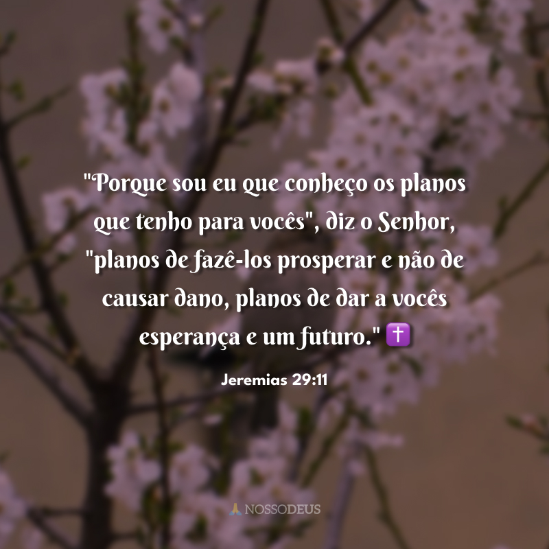 "Porque sou eu que conheço os planos que tenho para vocês", diz o Senhor, "planos de fazê-los prosperar e não de causar dano, planos de dar a vocês esperança e um futuro." ✝