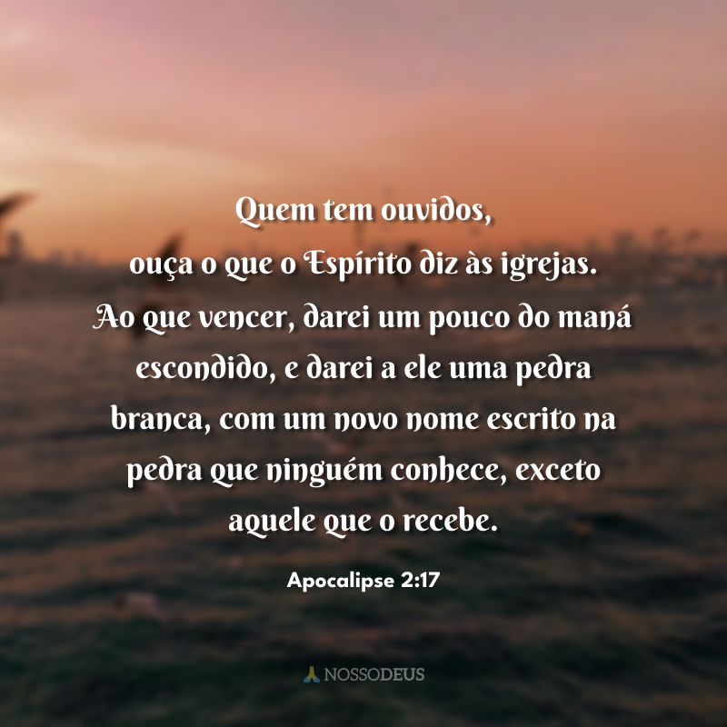 Quem tem ouvidos, ouça o que o Espírito diz às igrejas. Ao que vencer, darei um pouco do maná escondido, e darei a ele uma pedra branca, com um novo nome escrito na pedra que ninguém conhece, exceto aquele que o recebe.
