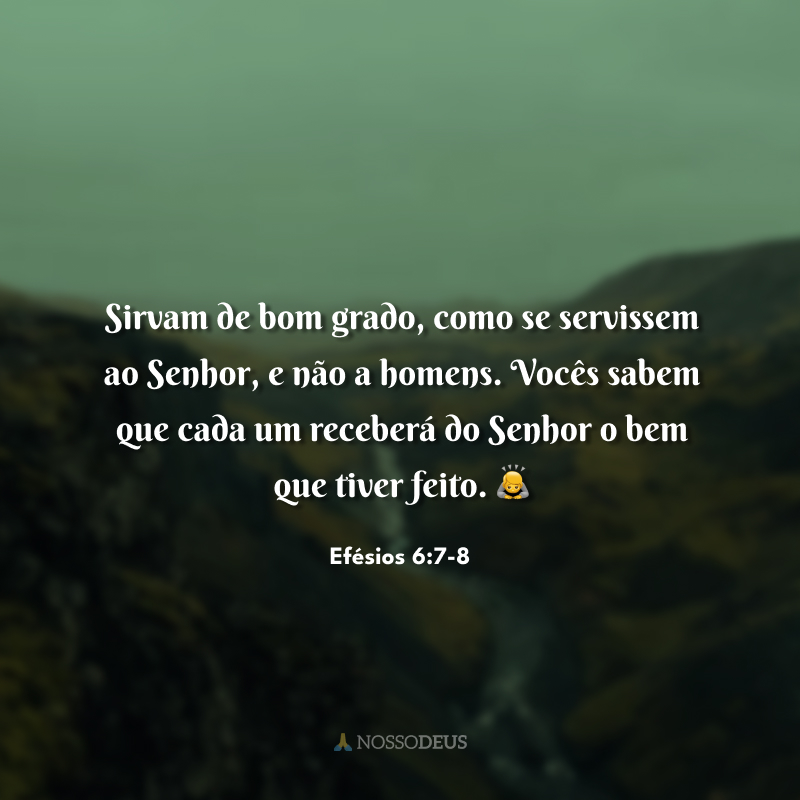Sirvam de bom grado, como se servissem ao Senhor, e não a homens. Vocês sabem que cada um receberá do Senhor o bem que tiver feito. 🙇