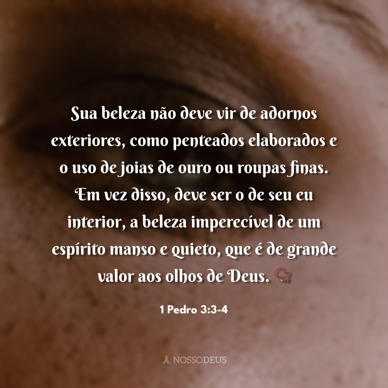 Sua beleza não deve vir de adornos exteriores, como penteados elaborados e o uso de joias de ouro ou roupas finas. Em vez disso, deve ser o de seu eu interior, a beleza imperecível de um espírito manso e quieto, que é de grande valor aos olhos de Deus. 📿