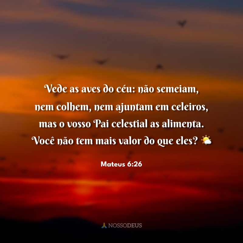 Vede as aves do céu: não semeiam, nem colhem, nem ajuntam em celeiros, mas o vosso Pai celestial as alimenta. Você não tem mais valor do que eles? 🌤