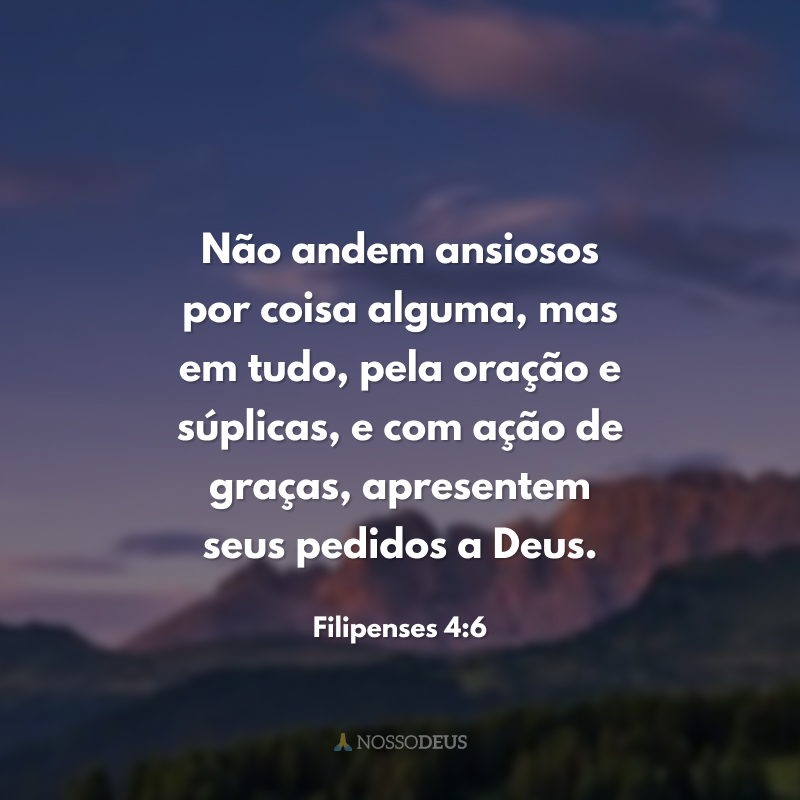 Não andem ansiosos por coisa alguma, mas em tudo, pela oração e súplicas, e com ação de graças, apresentem seus pedidos a Deus.