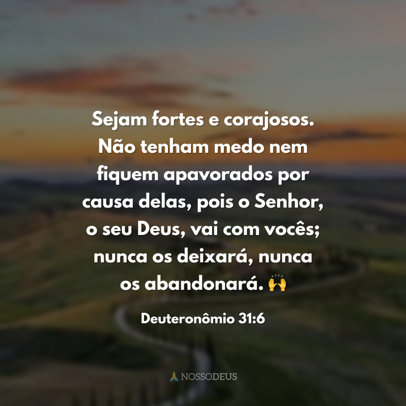 Sejam fortes e corajosos. Não tenham medo nem fiquem apavorados por causa delas, pois o Senhor, o seu Deus, vai com vocês; nunca os deixará, nunca os abandonará. 🙌