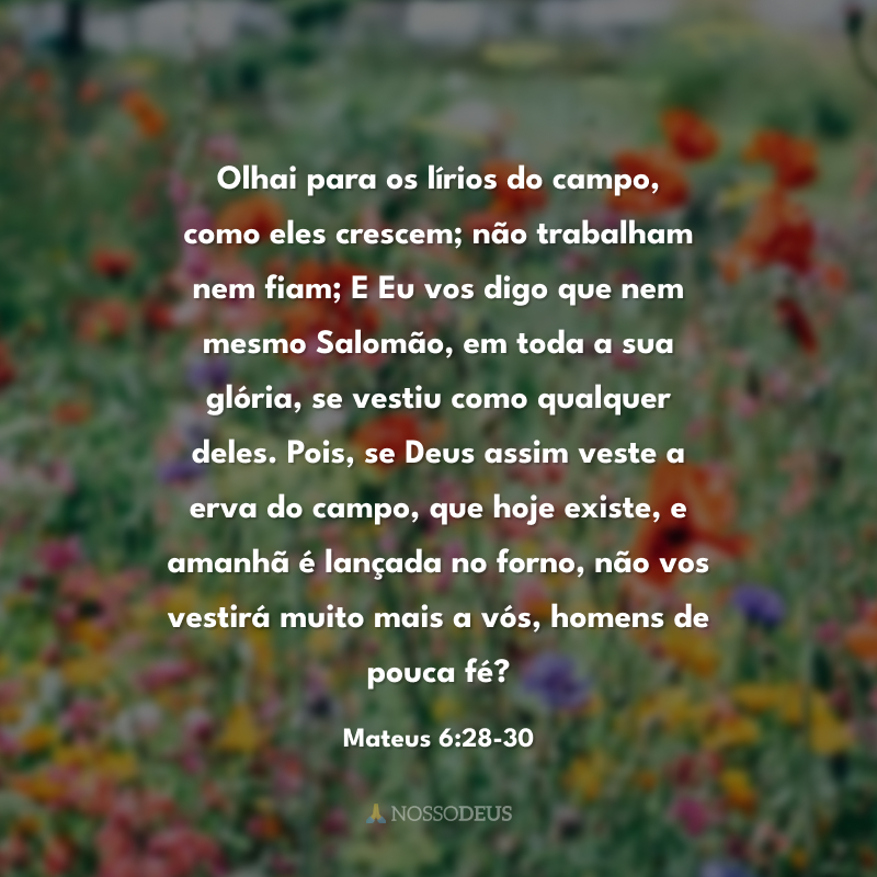 Olhai para os lírios do campo, como eles crescem; não trabalham nem fiam; E Eu vos digo que nem mesmo Salomão, em toda a sua glória, se vestiu como qualquer deles. Pois, se Deus assim veste a erva do campo, que hoje existe, e amanhã é lançada no forno, não vos vestirá muito mais a vós, homens de pouca fé?