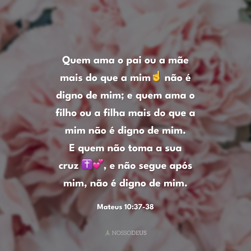 Quem ama o pai ou a mãe mais do que a mim☝️ não é digno de mim; e quem ama o filho ou a filha mais do que a mim não é digno de mim. E quem não toma a sua cruz ✝💕, e não segue após mim, não é digno de mim.