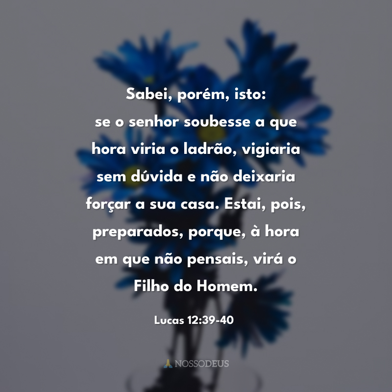 Sabei, porém, isto: se o senhor soubesse a que hora viria o ladrão, vigiaria sem dúvida e não deixaria forçar a sua casa. Estai, pois, preparados, porque, à hora em que não pensais, virá o Filho do Homem.