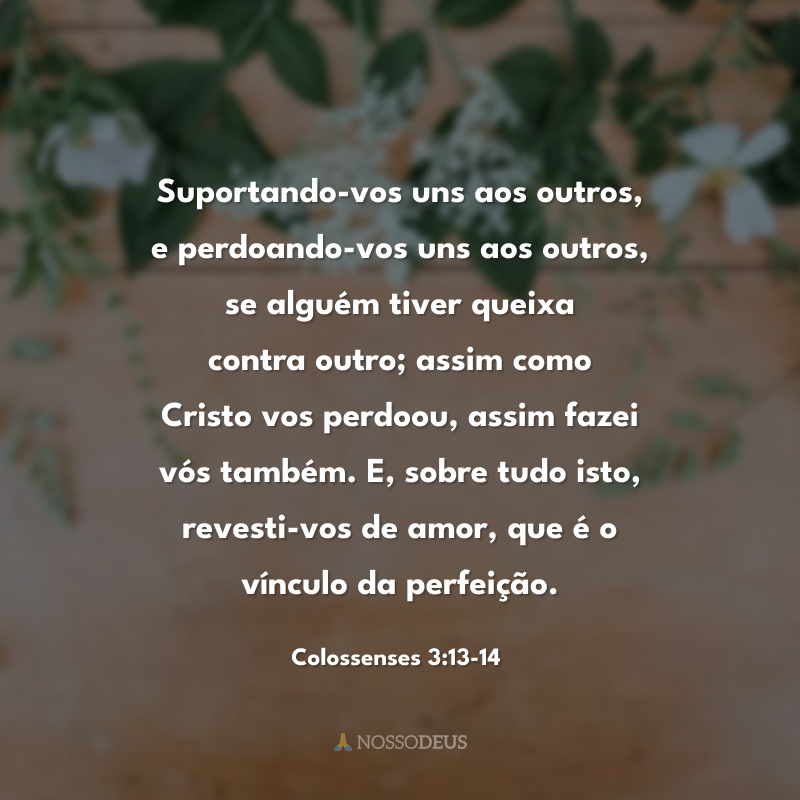 Suportando-vos uns aos outros, e perdoando-vos uns aos outros, se alguém tiver queixa contra outro; assim como Cristo vos perdoou, assim fazei vós também. E, sobre tudo isto, revesti-vos de amor, que é o vínculo da perfeição.